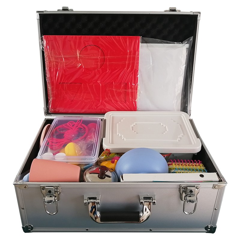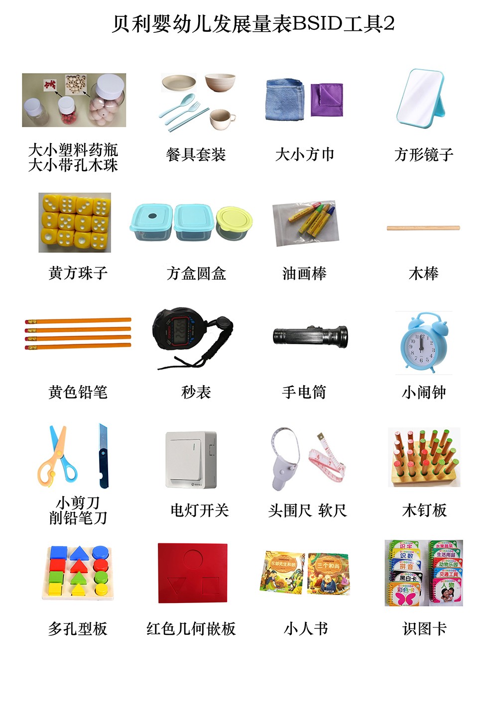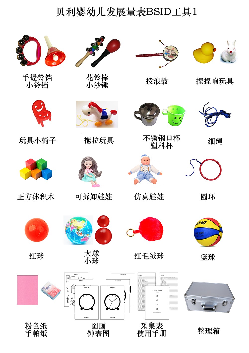 手握鈴鐺、小鈴鐺、花鈴棒、撥浪鼓、小沙錘、捏捏響玩具、玩具小椅子、拖拉玩具(帶線)、小正方體積木(紅12個,黃藍綠各2塊)、可拆卸娃娃、布娃娃、圓環、紅球、大球、紅毛絨球、籃球、紅色小球、細繩、不銹鋼口杯、塑料杯、大號塑料藥瓶、小號塑料藥瓶、餐具套裝、大小方巾、方形鏡子、大木珠(帶孔)、小木珠(帶孔、)黃方珠子、塑料方盒、塑料圓盒、油畫棒、指揮棒、黃色鉛筆、秒表、手電筒、小鬧鐘、電燈開關、頭圍尺、軟尺、木釘板、多孔型板(含圓形、方形、三角形各4塊)、幾何嵌板(含圓、三角、方形,厚8mm)、小人書識圖卡(果蔬、人物、動物、交通等)、粉色卡紙、手帕紙、鐘表圖1234、圖畫12(BSID)、BSID采集表、BSID使用手冊、整理箱等。